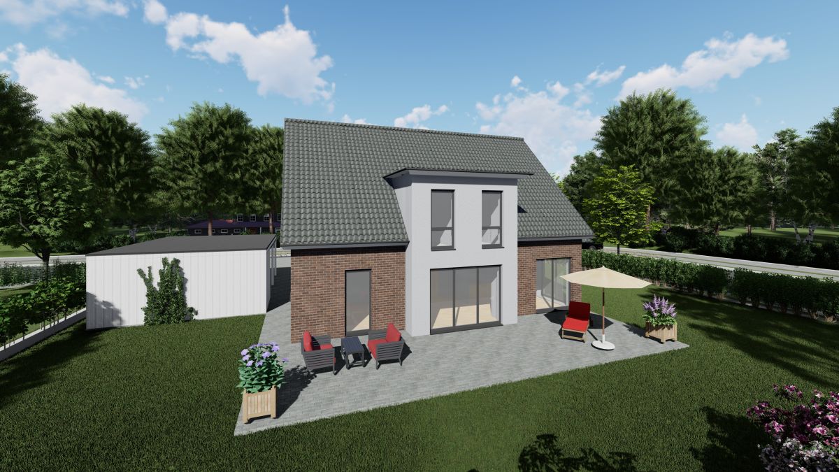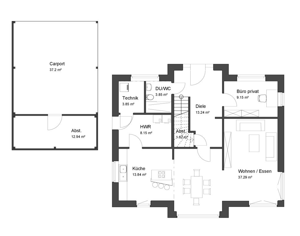 Erdgeschoss: offener Wohn- / Ess- und Kochbereich, HWR, separater Technikraum, Gäste-WC und Büro