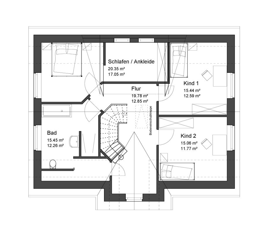 Obergeschoss: 2 Zimmer, Schlafzimmer mit Ankleide und Badezimmer mit 2 Eingängen