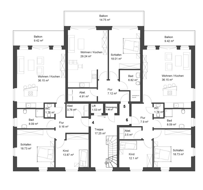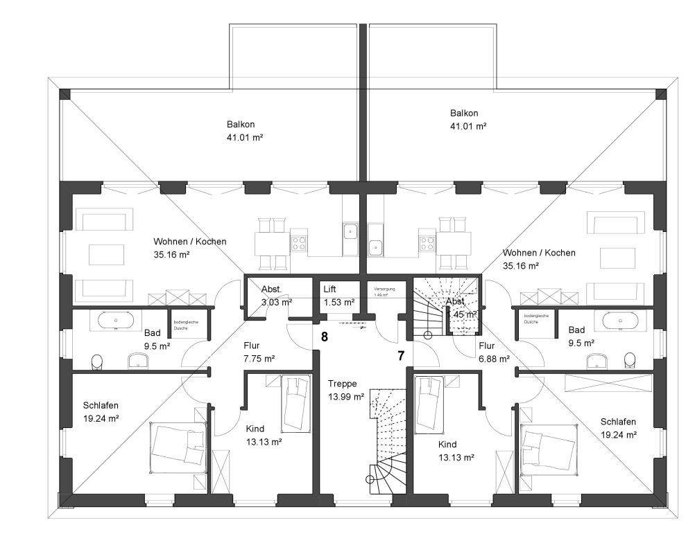 ca. 2 x 90 m², 2 x 66 m², und 4 x 87 m² Wohnfläche