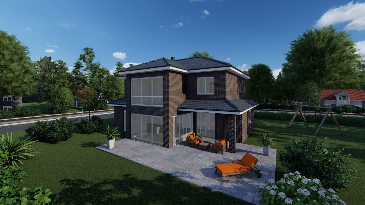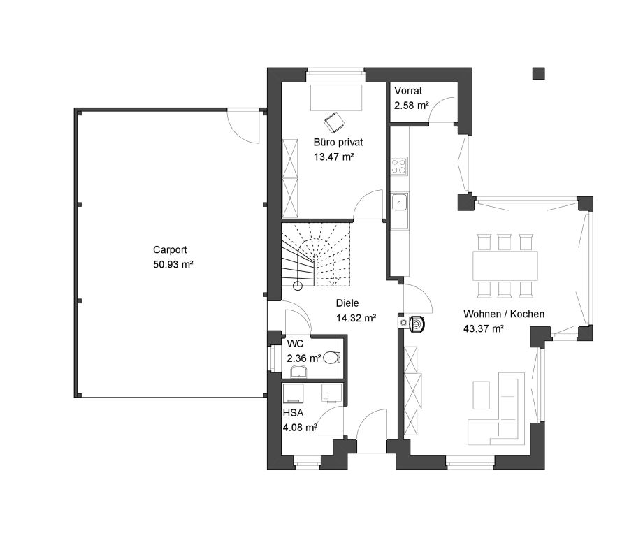 Erdgeschoss: offener Wohn- / Ess- und Kochbereich, HWR, Gäste-WC und Büro