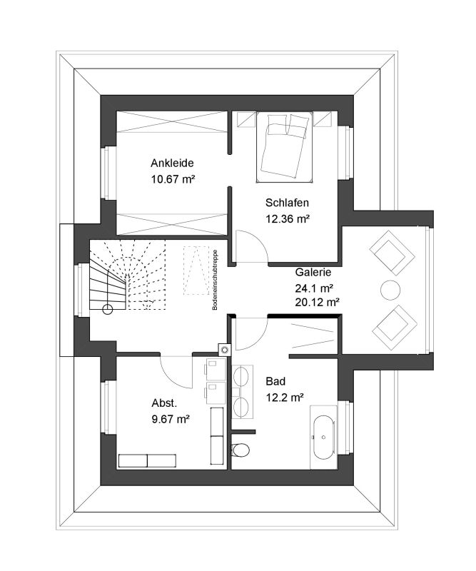 Obergeschoss: Schlafzimmer mit Ankleide, Badezimmer, Abstellraum und offene Galerie