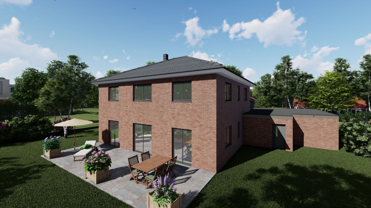 Erdgeschoss: geräumiger Wohn-/Koch- und Essbereich mit kleinem Vorratsraum, Büro, HWR und Gäste-WC mit Dusche